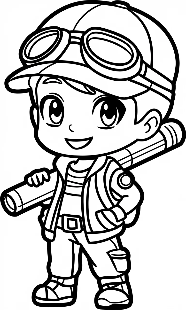 Odkryj uroczą kolorowankę dla najmłodszych, przedstawiającą sympatycznego, małego odkrywcę w czapce z goglami. Ten wesoły bohater, narysowany w charakterystycznym stylu chibi z dużą głową i mniejszym ciałem, jest ubrany w strój przygodowy, gotowy na każdą wyprawę. Wyraziste, przejrzyste linie rysunku świetnie nadają się do kolorowania, zachęcając dzieci do kreatywnej zabawy. Idealna
