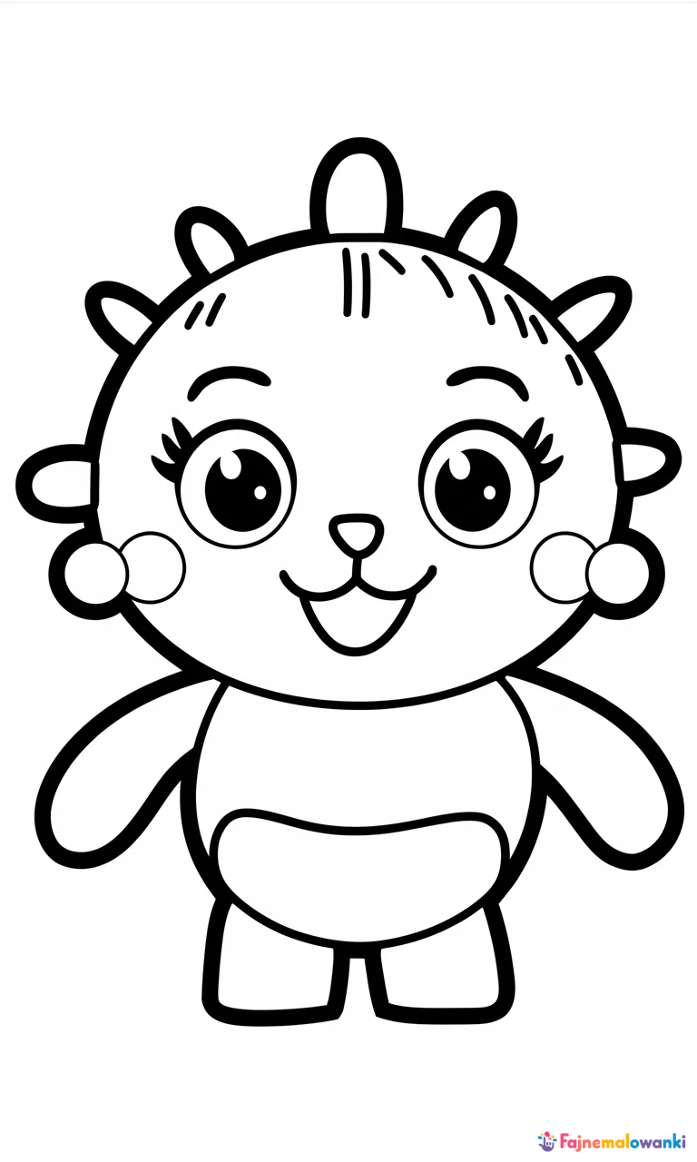 Zachęcająca kolorowanka dla dzieci, prezentująca sympatyczną, misiową postać z dużymi, przyjaznymi oczami i uśmiechniętą buźką. Ta pulchna figurka, ozdobiona delikatnymi pikami na głowie, posiada krótkie, masywne ramiona i prosty kontur ciała, co ułatwia malowanie najmłodszym. Wyraźne, czyste linie kształtów idealnie nadają się do kreatywnej zabawy z kredkami.