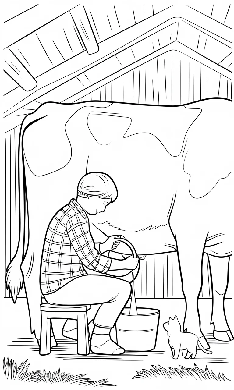 Odkryj uroki wiejskiego życia z naszą kolorowanką dla dzieci, na której widnieje scena z gospodarstwa. Znajdziesz tu rysunek osoby dojącej krowę w stodole, która siedzi na małym stołku i ma na sobie kraciastą koszulę. Obok postaci stoi wiadro na mleko, a uważnie wszystko obserwuje mały kotek. W tle zarysowane są drewniane belki i słoma na podłodze, tworząc idealne tło do kreatywn
