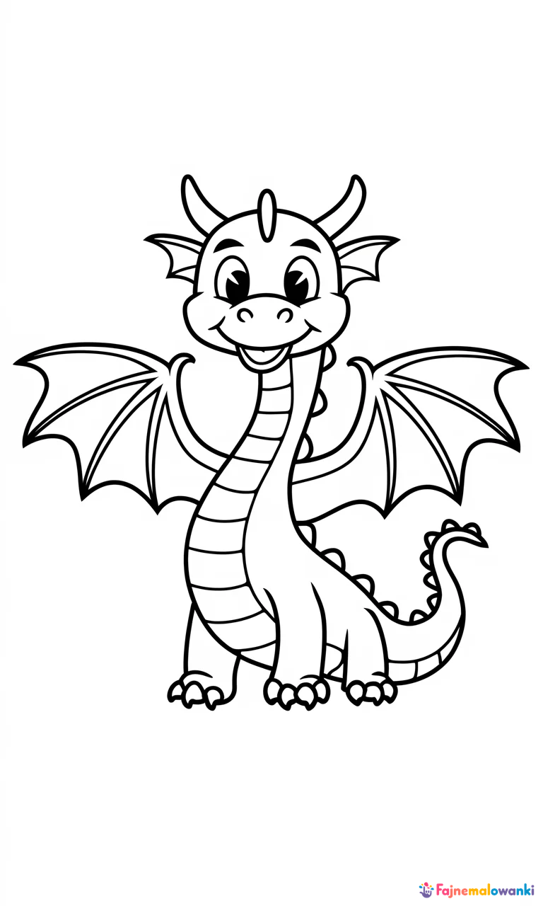 Zachęcająca kolorowanka dla dzieci ukazuje uśmiechniętego smoka z szeroko rozpostartymi skrzydłami. Jego zaokrąglone kształty, wesołe oczy i łagodne linie ciała, które tworzą kształt litery S, sprawiają, że postać jest przyjazna i idealna dla młodych artystów. Smok z radosnym wyrazem twarzy i długą, falującą szyją, zapewni mnóstwo kreatywnej zabawy podczas kolorowania.