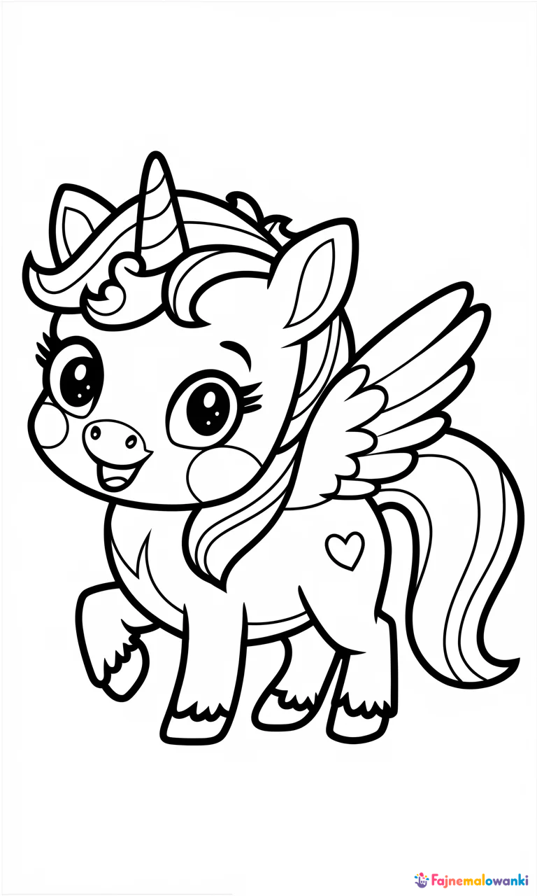 Zachwyć swoje dziecko tą czarującą kolorowanką, przedstawiającą bajecznego jednorożca z małymi skrzydełkami. Ten sympatyczny, kreskówkowy stworek, z dużymi, pełnymi wyrazu oczami i spiralnym rogiem, zaprasza do wspólnej zabawy w kolorowanie. Jego delikatne skrzydełka, puchata grzywa oraz ogon dodają uroku, a małe serduszko na boku dodatkowo uroczo zdobi obrazek. Kontury są