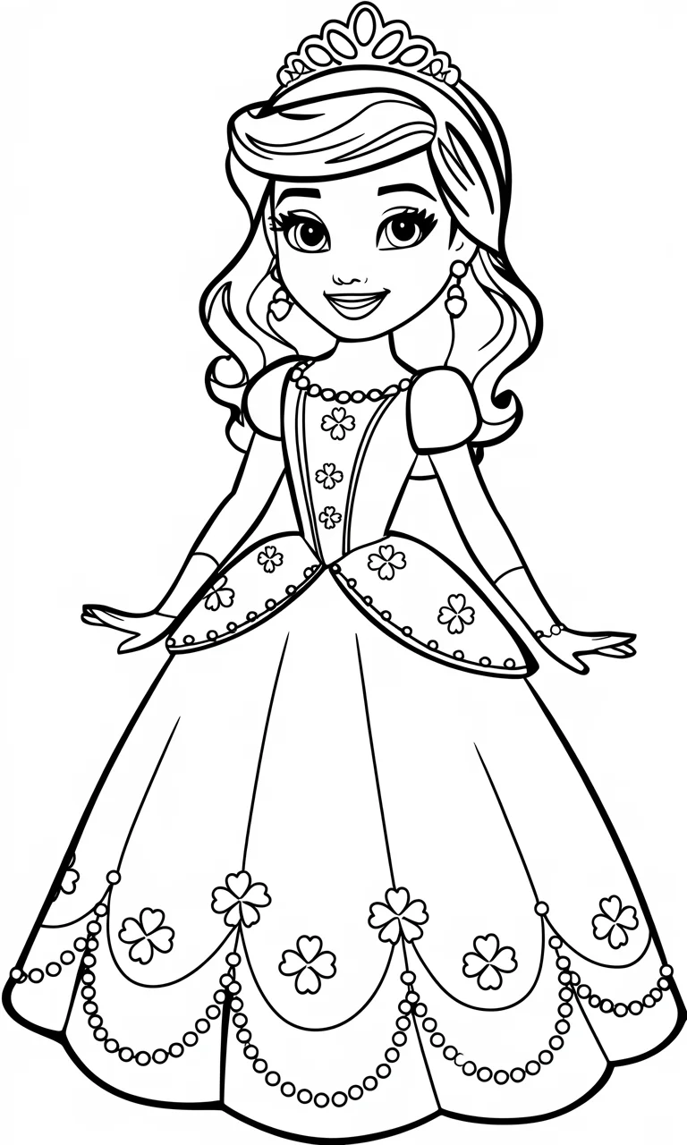 Kolorowanka dla dzieci przedstawiająca młodą, czarującą księżniczkę w eleganckiej sukni balowej z detalami w postaci koniczyn i perełkowego zdobienia. Jej faliste włosy zdobi delikatna tiara, a uroczy uśmiech dodaje wdzięku. Suknia jest pełna i zwiewna, z bogato zdobionym dołem. Postać rysowana jest w przyjaznym dla dzieci stylu, z wyraźnymi liniami, idealnymi do kolorowania.