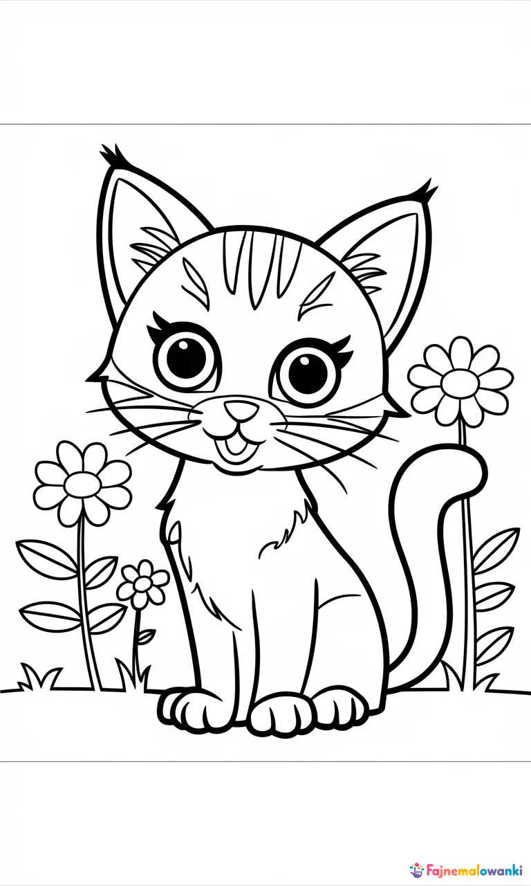 Kolorowanka dla najmłodszych przedstawiająca słodkiego kotka w ogrodowym otoczeniu, idealna do rozwijania kreatywności dzieci. Na ilustracji znajduje się kociak z dużymi, okrągłymi oczami i puszystym ogonem, otoczony prostymi kwiatami i liśćmi. Scena ogrodowa z wyraźnymi konturami doskonale nadaje się do kolorowania i wprowadza spokojną atmosferę, sprzyjającą dziecięcej zabawie.