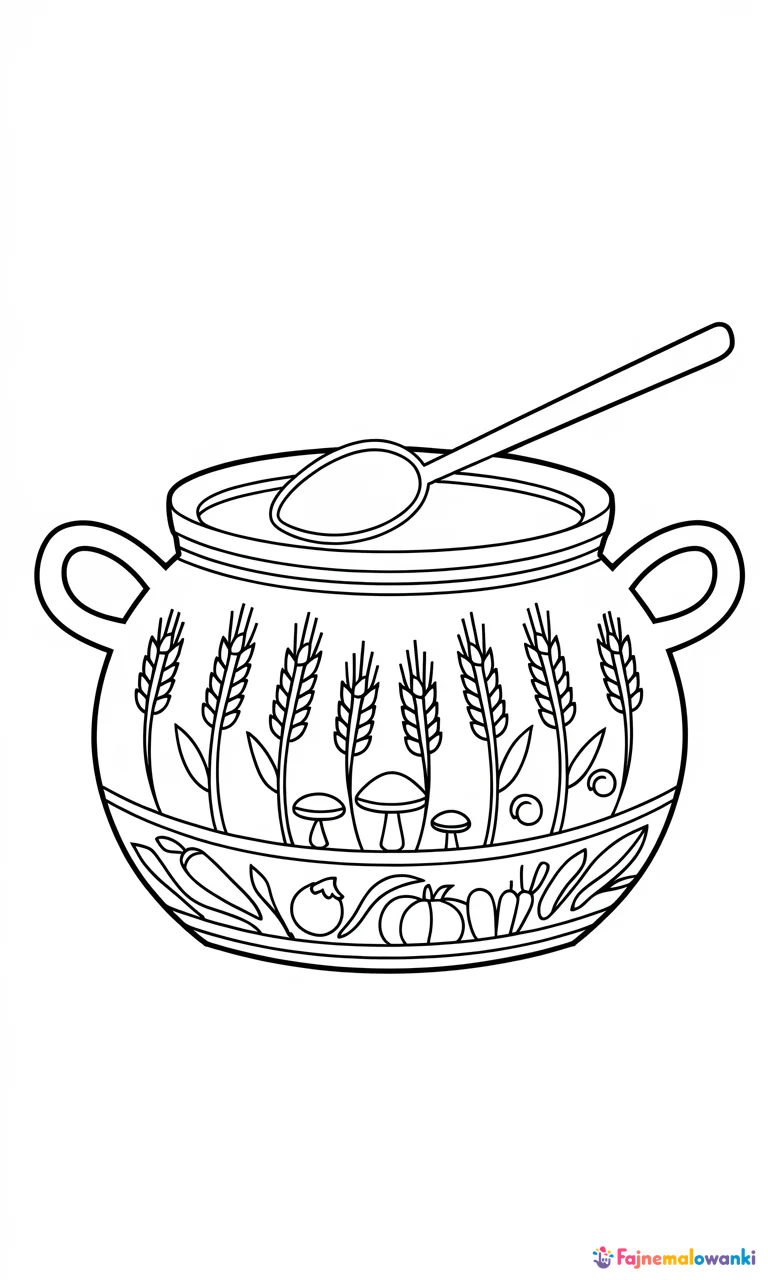 Zachęcamy do pobrania naszej kolorowanki dla dzieci, przedstawiającej tradycyjny garnek kuchenny, ozdobiony motywami żniwnymi. Na dnie garnka widoczne są kłosy zboża, grzyby i warzywa, co dodaje mu uroku. Do garnka przylega duża łyżka, idealna dla małych rączek do „gotowania”. Prosty styl rysunku sprawia, że kolorowanie jest łatwe i przyjemne, idealne dla młodych artystów. Idealna aktywność
