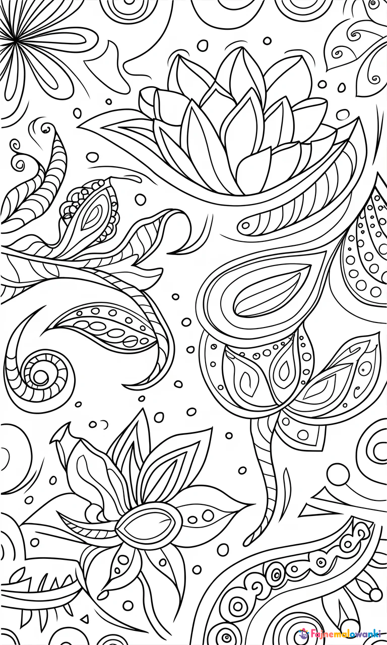 Nasza kolorowanka dla dzieci to prawdziwe dzieło sztuki, które łączy w sobie zaawansowane wzory kwiatowe i geometryczne. Detale takie jak warstwowe kwiaty, wirujące ornamenty paisley, wijące się pnącza oraz różnorodne kształty geometryczne, w tym koła, krzywe i linie zygzakowate, wypełniają stronę, tworząc skomplikowaną, niemal medytacyjną przestrzeń do kolorowania. Drobne elementy dekoracyjne, takie jak kropki