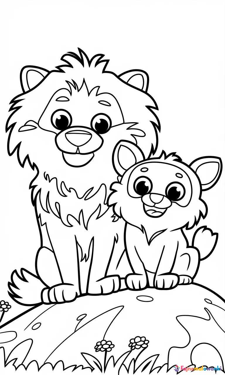 Kolorowanka dla dzieci z sympatycznymi postaciami – duże, puszyste stworzenie o przyjacielskim wyrazie twarzy i jego mniejszy, radosny towarzysz. Siedzą na kamienistej górce, otoczeni przez małe rośliny i kwiaty. Czyste, wyraźne linie ilustracji są idealne dla młodych artystów. Pobierz i wydrukuj, by zachęcić dzieci do kreatywnej zabawy. Idealna dla przedszkolaków!