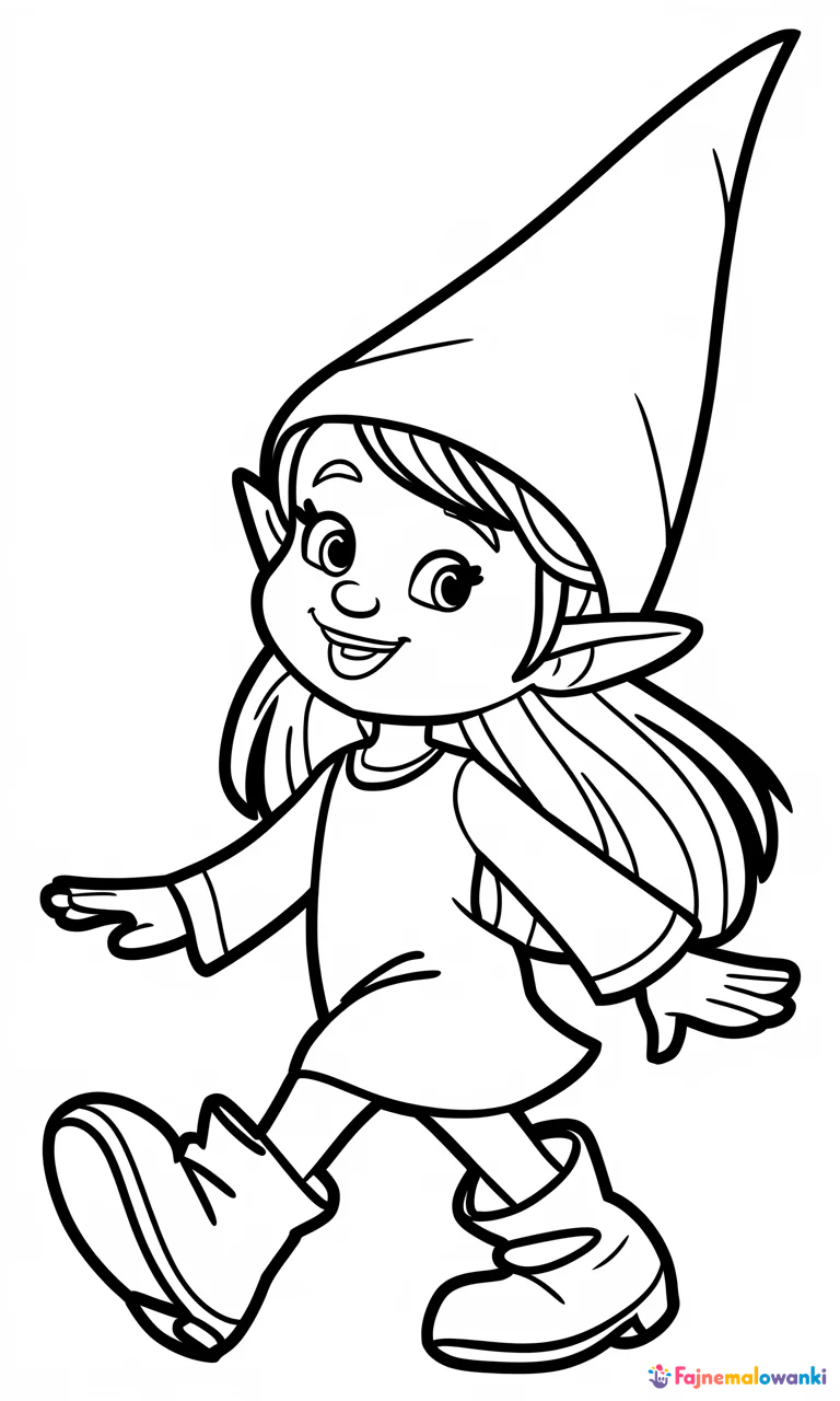 Zachęcająca do kreatywności kolorowanka dla dzieci przedstawia radosnego, kreskówkowego skrzata leśnego w charakterystycznej, spiczastej czapce i prostym stroju. Ten wesoły bohater, z długimi, falującymi włosami i dużymi butami, uchwycony został w dynamicznej pozie – jakby tańczył lub maszerował. Prosta i czytelna linia rysunku sprawia, że jest to idealna propozycja dla młodszych dzieci, które mogą rozwijać swoje umie