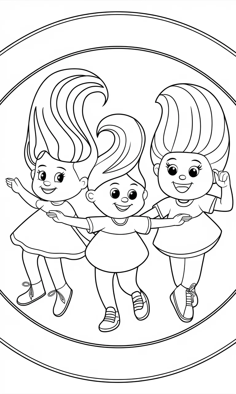 Odkryj urokliwą kolorowankę dla dzieci, gdzie trzy wesołe postacie z zabawnymi, wysokimi fryzurami tańczą trzymając się za ręce. Ich okrągłe ciała i duże, wyraziste twarze pełne są radości i dynamiki. Całość otoczona jest prostym, okrągłym obramowaniem, idealnym do kreatywnego kolorowania. Idealna strona do wspólnego malowania i rozwijania wyobraźni malucha.