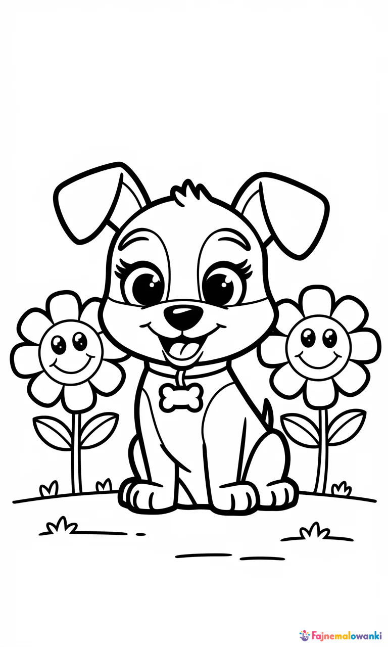 Odkryj urokliwą kolorowankę dla dzieci, przedstawiającą zabawnego szczeniaka z wystawionym językiem, który siedzi otoczony przez roześmiane kwiaty. Ten sympatyczny piesek, z dużymi oczami i opadającymi uszami, ma na sobie obrożę z zawieszką w kształcie kości. Kwiaty z radosnymi twarzami i szerokimi płatkami dodają uroku ilustracji. Sceneria z prostym tłem i niewielkimi kępkami trawy