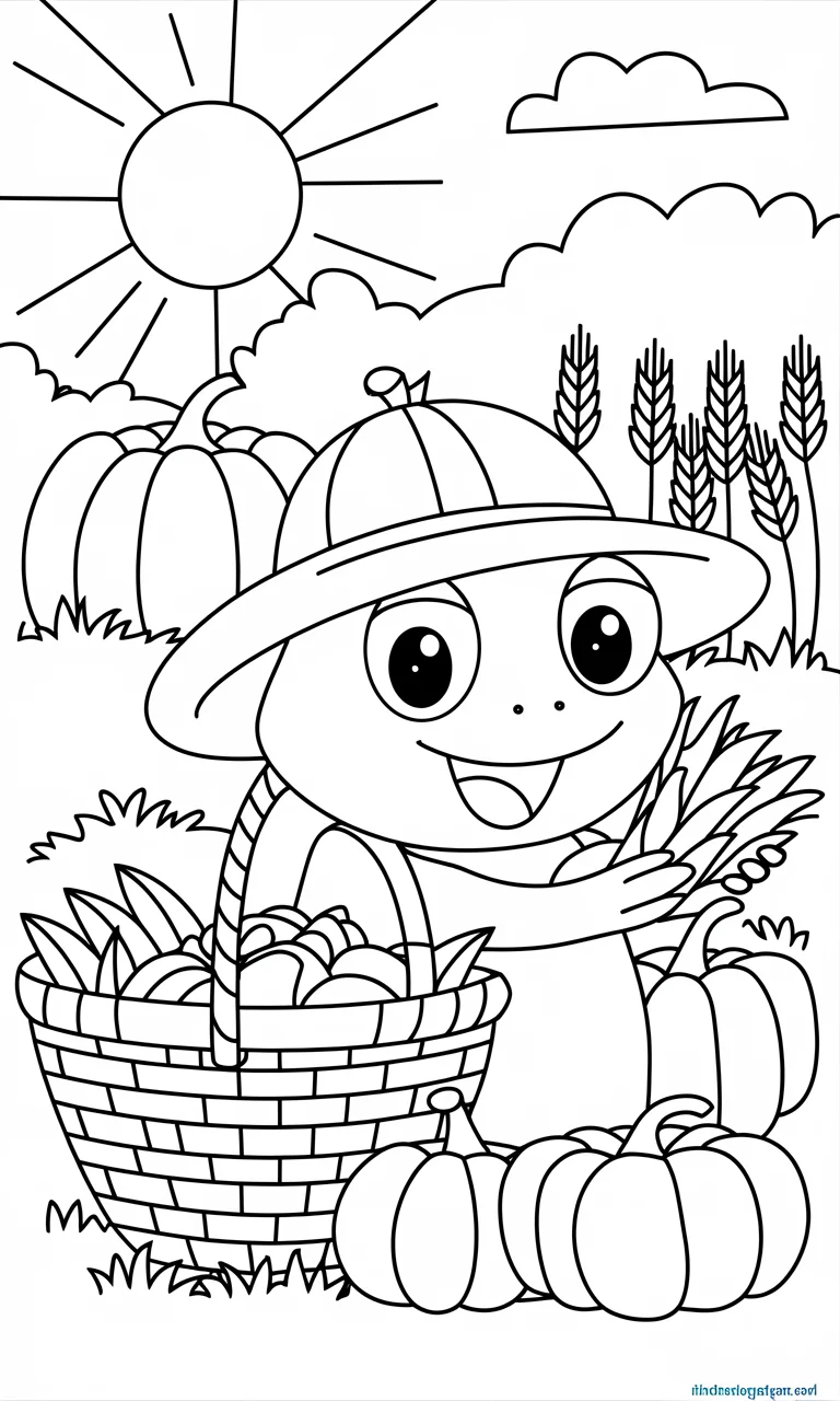 Odkryj uroczy świat przyrody z naszą kolorowanką dla dzieci, przedstawiającą wesołą żabkę w kapeluszu ogrodnika, otoczoną świeżymi plonami w plecionym koszyku. Tło ilustracji zdobią dynie i kłosy pszenicy, a nad całością unosi się słoneczne niebo z obłokami. Jasne, wyraźne linie obrazu idealnie nadają się do kolorowania, oferując różnorodność tekstur i wzorów. Idealna propozycja dla mał