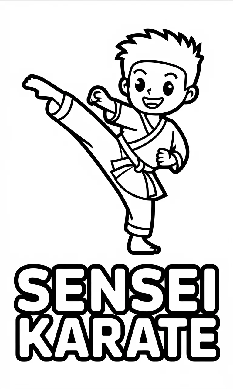 Zachęć swoje dziecko do odkrywania świata sztuk walki dzięki atrakcyjnej kolorowance przedstawiającej młodego karatekę w akcji. Na ilustracji widzimy energiczne ujęcie postaci w tradycyjnym stroju karate gi, wykonującej wysoki kopnięcie bocznego. Spiczaste włosy postaci dynamicznie odlatują do tyłu, podkreślając ruch i energię momentu. Charakterystyczny uśmiech na twarzy bohatera dodaje ilustracji pozytywnego