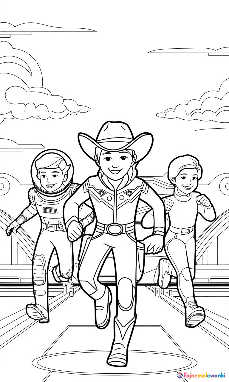 Zachęcająca kolorowanka dla dzieci przedstawiająca trójkę przyjaciół w pełnych przygód kosmicznych strojach. Centralną postacią jest bohater w kowbojskim kapeluszu i stylizacji westernowej, wzbogaconej butami. Po jego lewej stronie widzimy postać futurystycznego strażnika kosmosu w ochronnym pancerzu, a po prawej radosnego towarzysza w codziennym ubraniu. Grupa wydaje się biec przez bogato zdobione tło, na którym zazn