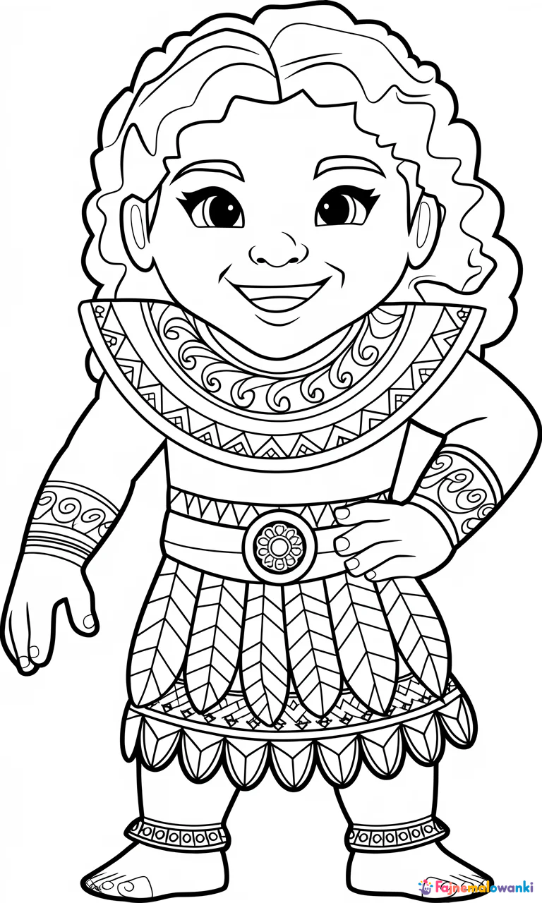 Zapraszamy do zabawy z kolorowanką dla dzieci przedstawiającą radosnego wojownika z wysp Pacyfiku w tradycyjnym stroju. Bohater, ubrany w liściastą spódnicę i ozdobny top z wirującymi wzorami tatuaży, prezentuje się w pewnej siebie pozie z uśmiechem. Dzięki skomplikowanym wzorom na ubraniu i akcesoriach, kolorowanka staje się fascynującą aktywnością dla najmłodszych. Idealna do druku, rozwija k