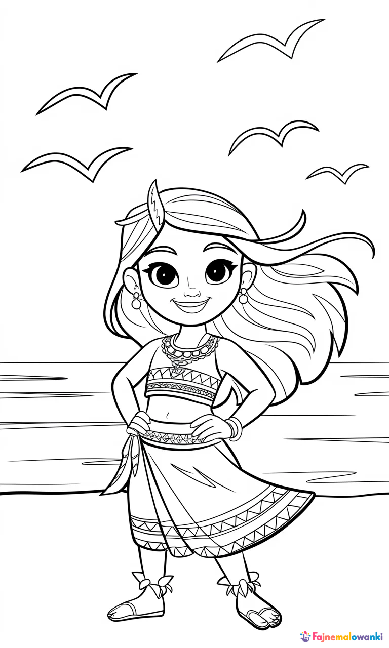 Zachęcająca kolorowanka dla dzieci przedstawia odważną dziewczynkę ubraną w stroje inspirowane polinezyjską kulturą. Jej długi, falujący włos i sympatyczny uśmiech dodają uroku ilustracji. W tle widoczny jest ocean i przelatujące ptaki, a całość utrzymana jest w dziecięco-zachęcającym stylu z wyraźnymi liniami idealnymi do kolorowania. Idealna zabawa kreatywna dla Twojego dziecka, dostępna do wydruku.